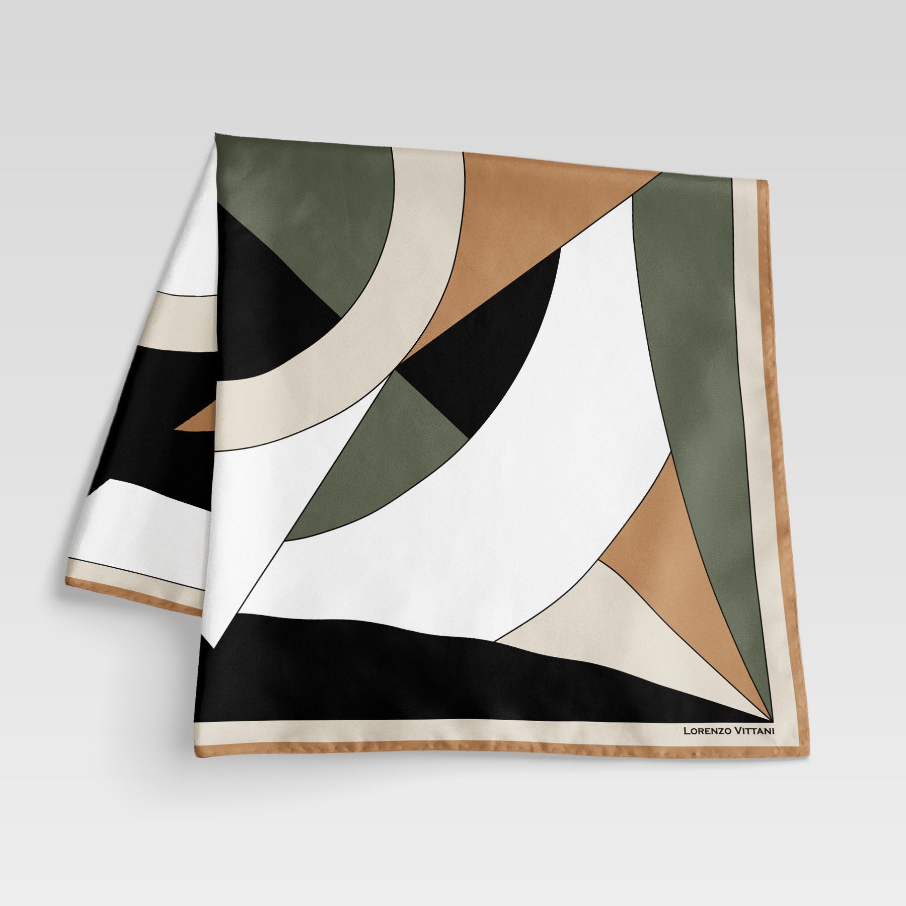 Beautiful geometric design featuring curved shapes in different shades of camel, muted greens, light beige and black. Highlighted by natural silk white.